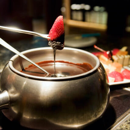 A melting pot filled with your choice of white, milk or dark chocolate with a plate of fruit.