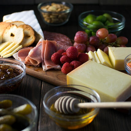 Delicious board of crackers, cheese, grapes, honey, meat of all kind and gherkins.